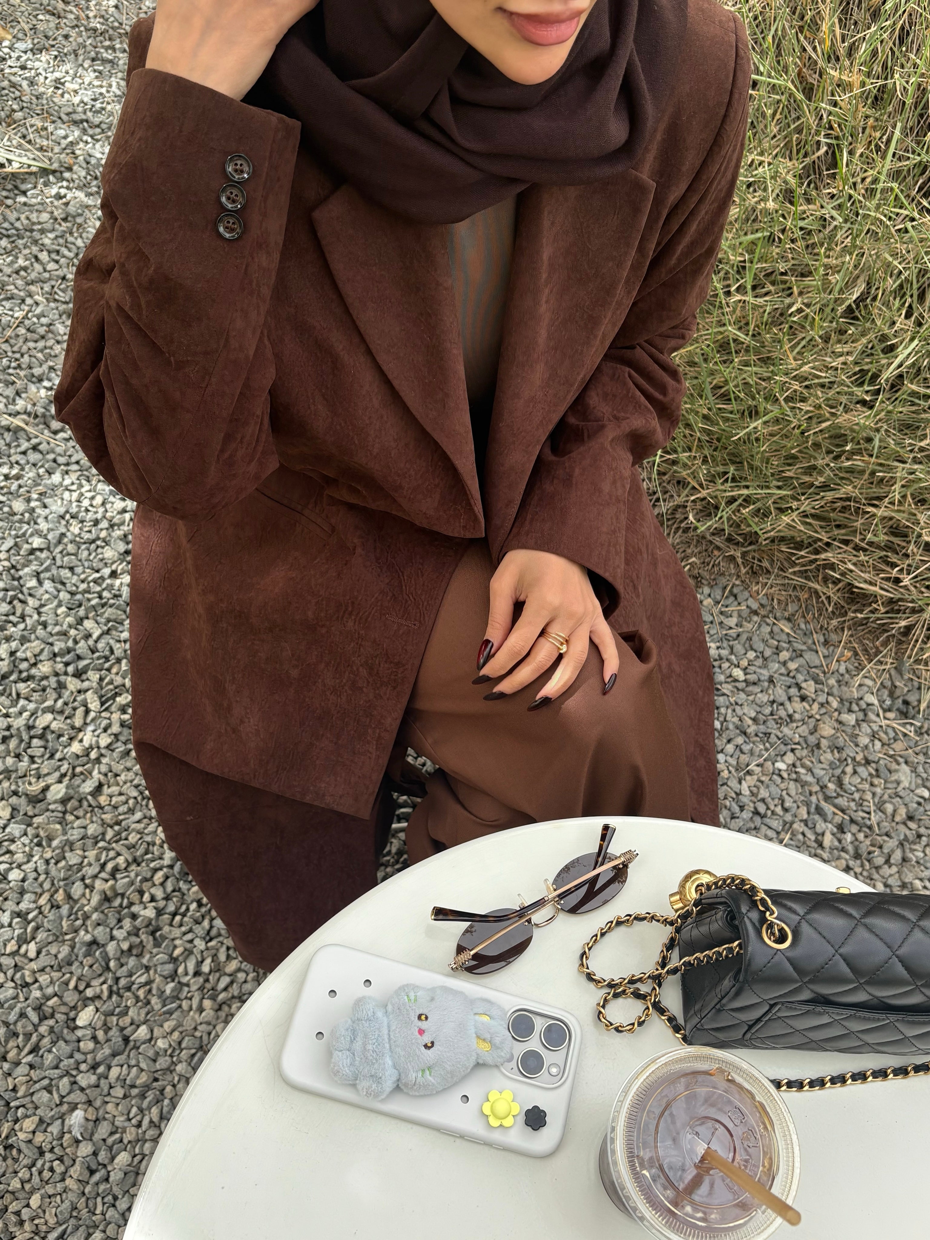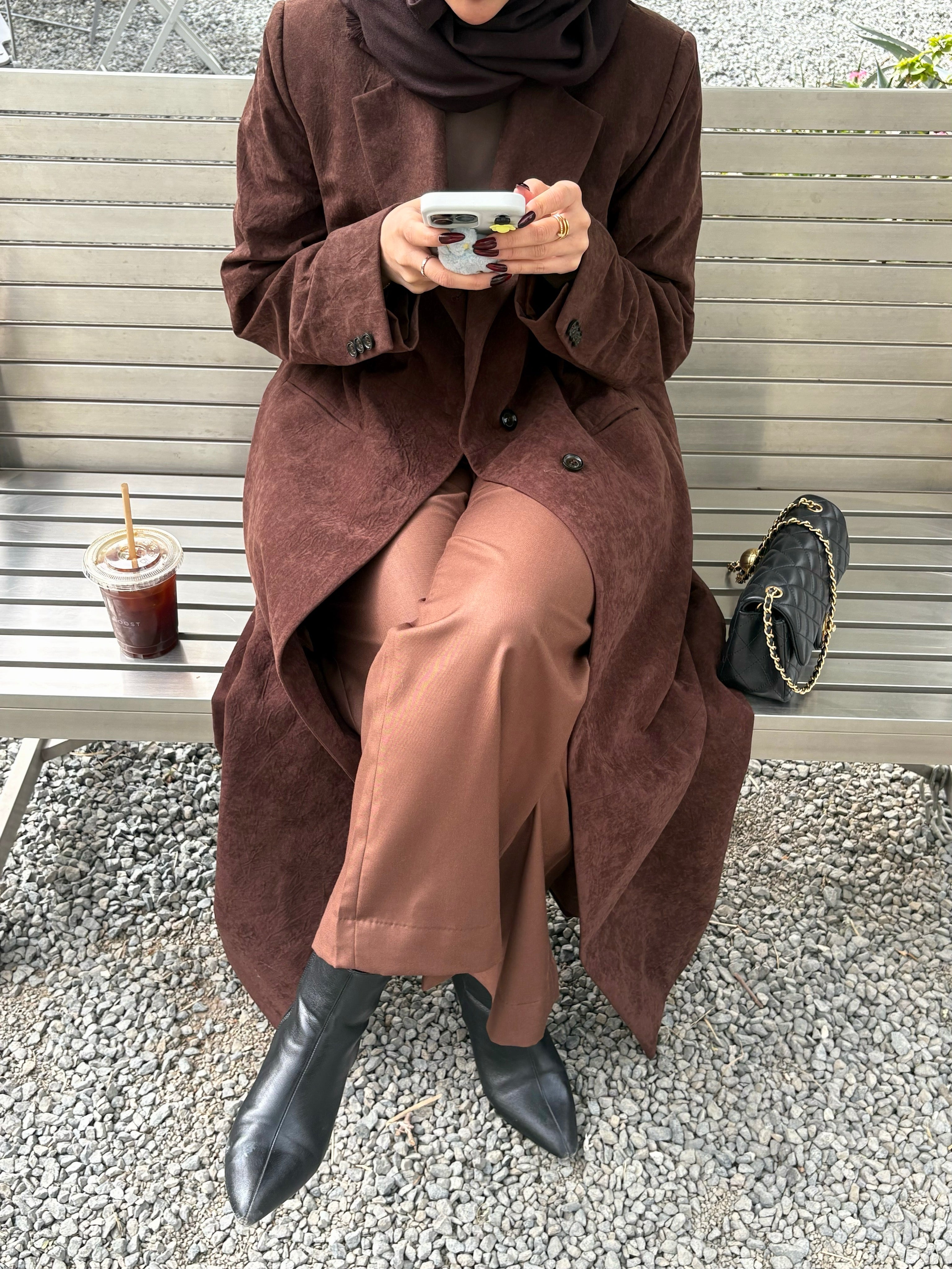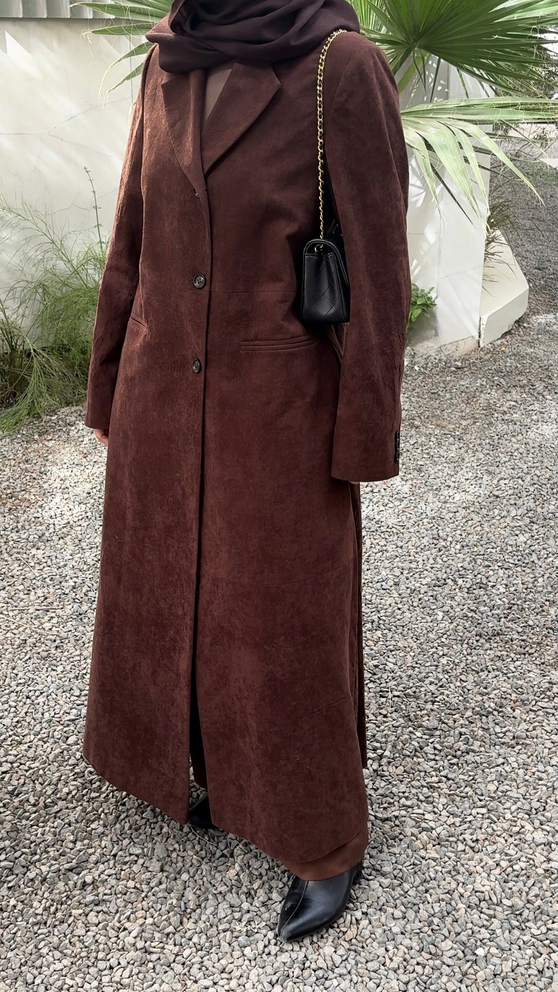 A Limited edition long straight-cut blazer crafted from fully lined distressed suede with a matte surface. Designed with a classic blazer collar, front button fastening, and side pockets.