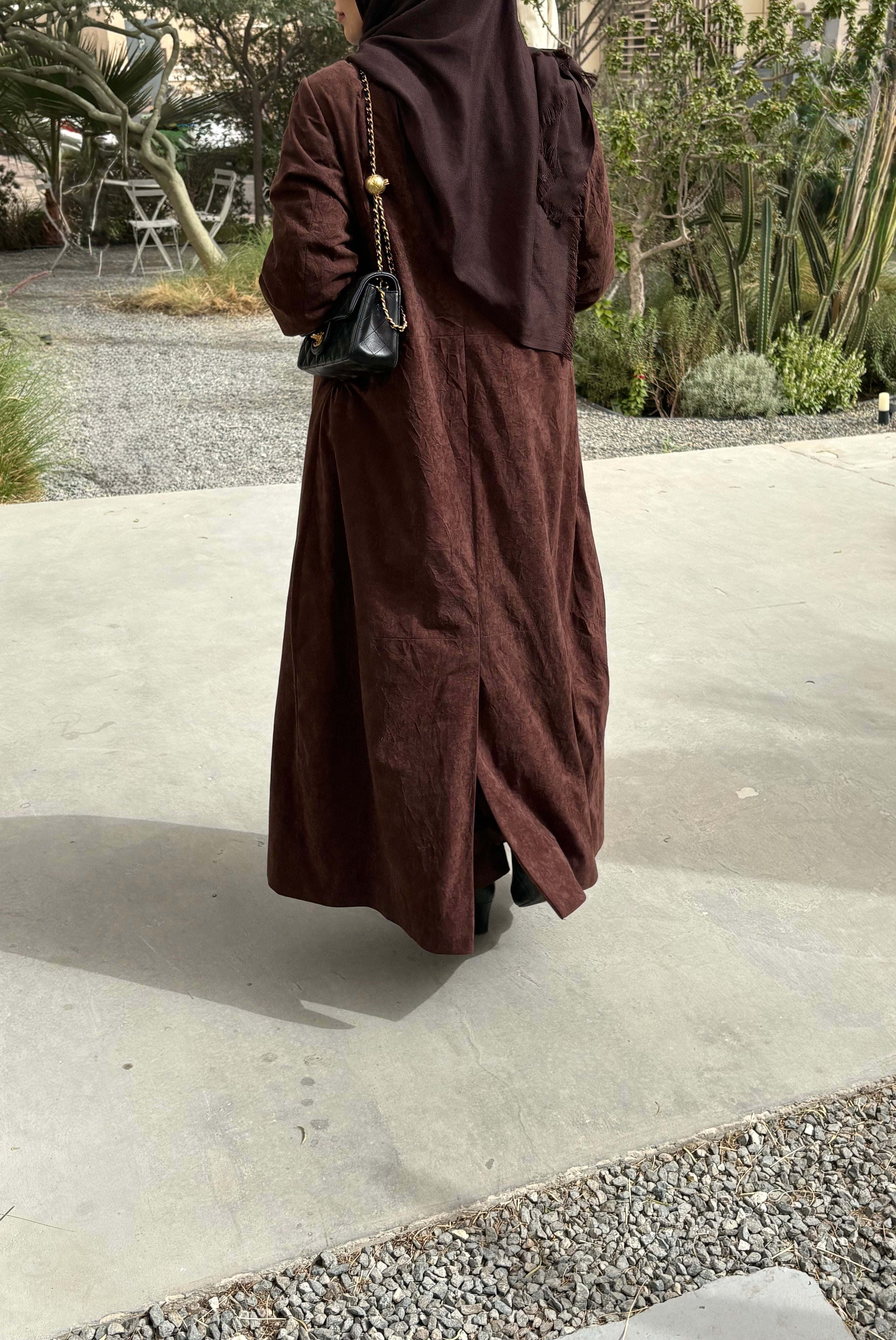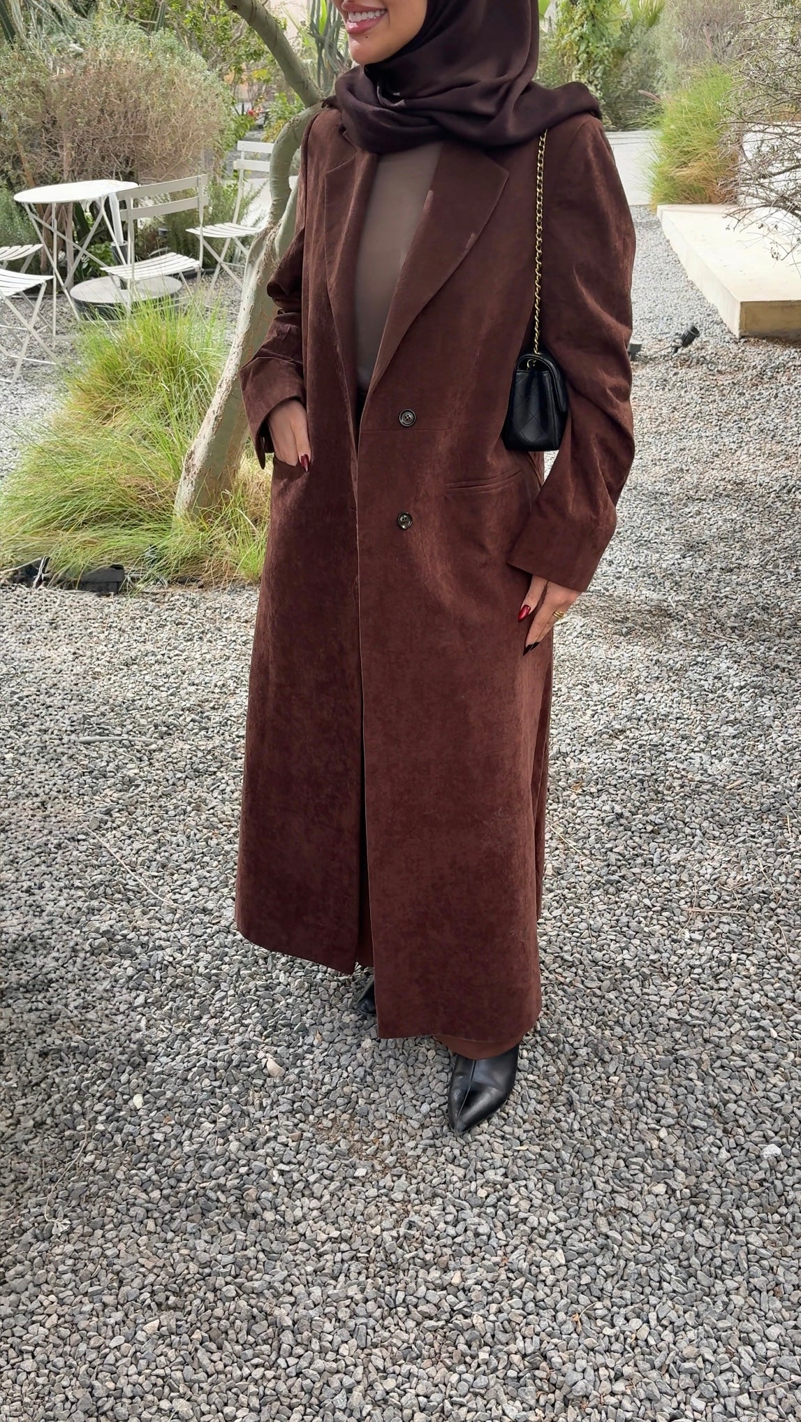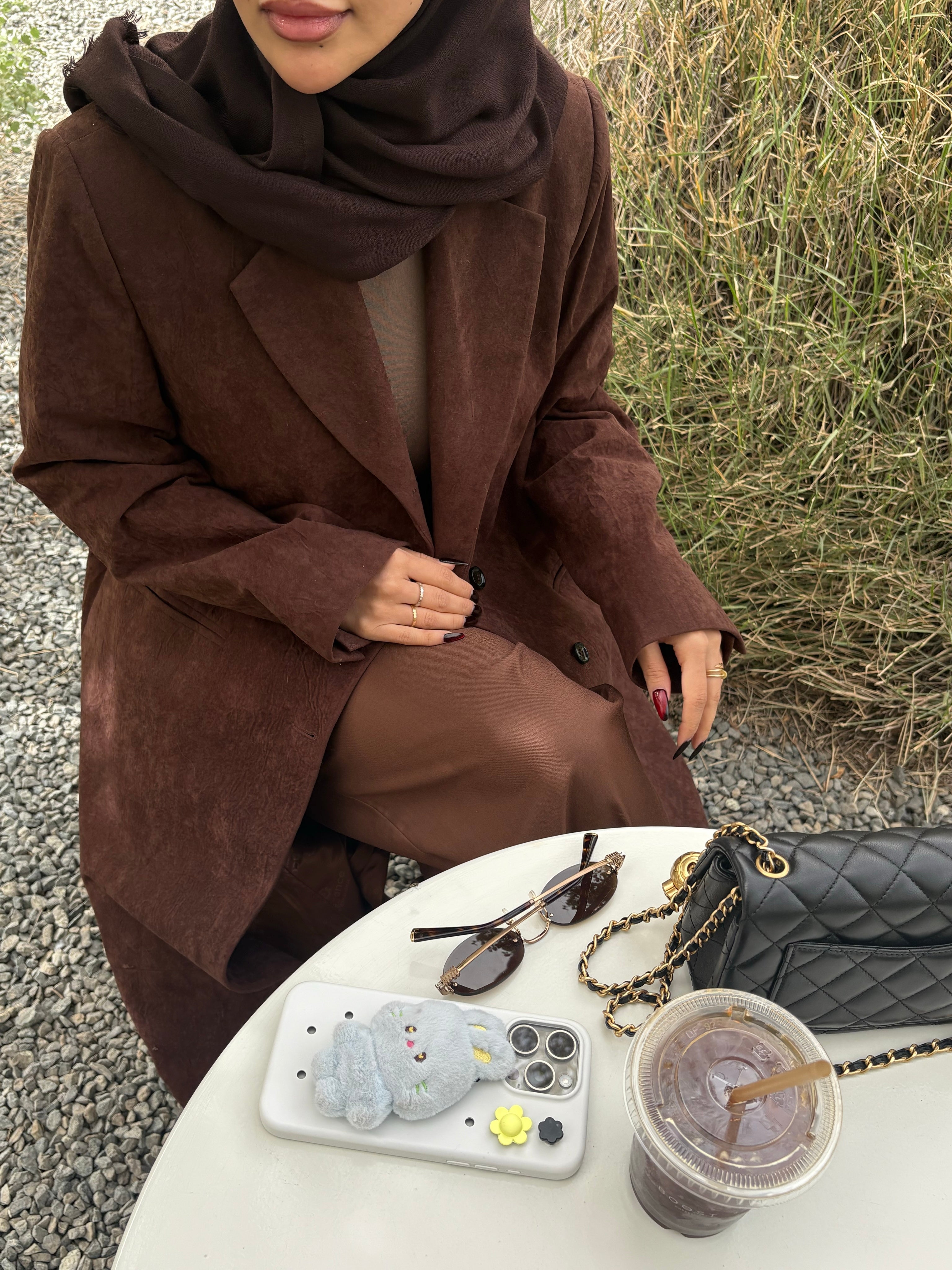 A Limited edition long straight-cut blazer crafted from fully lined distressed suede with a matte surface. Designed with a classic blazer collar, front button fastening, and side pockets.